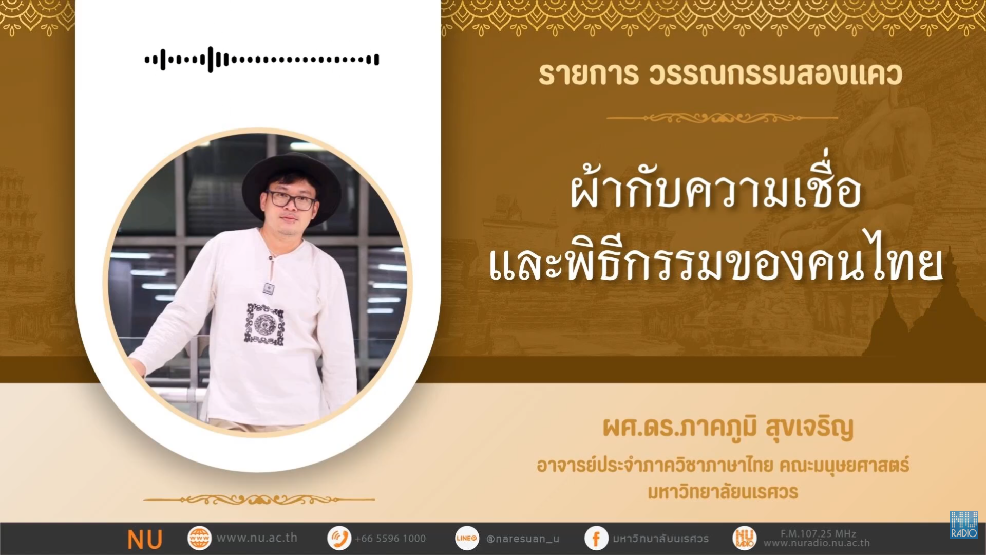 - ดำเนินรายการโดย : ผศ.ดร.ภาคภูมิ สุขเจริญ ภาควิชาภาษาไทย คณะมนุษยศาสตร์ มหาวิทยาลัยนเรศวร