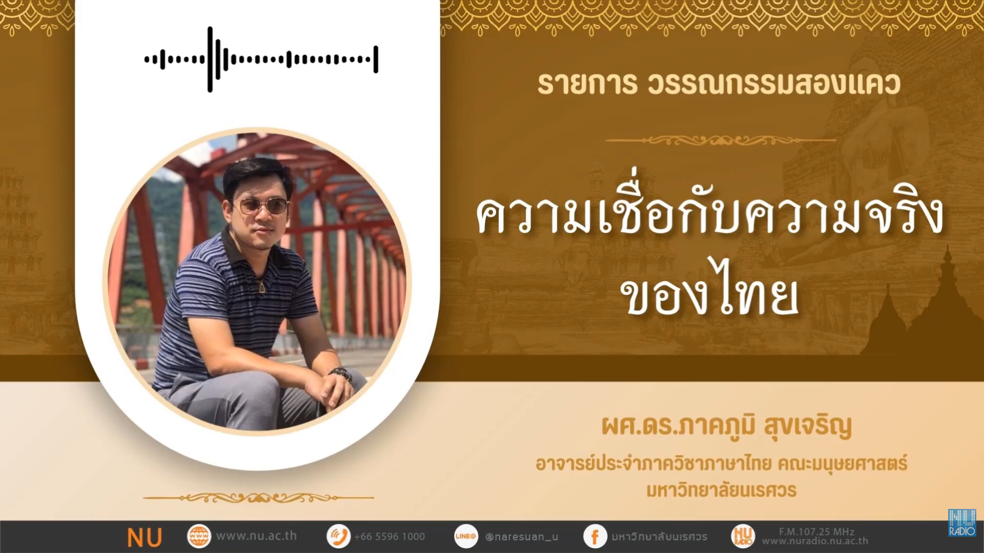 - ดำเนินรายการโดย : ผศ.ดร.ภาคภูมิ สุขเจริญ ภาควิชาภาษาไทย คณะมนุษยศาสตร์ มหาวิทยาลัยนเรศวร