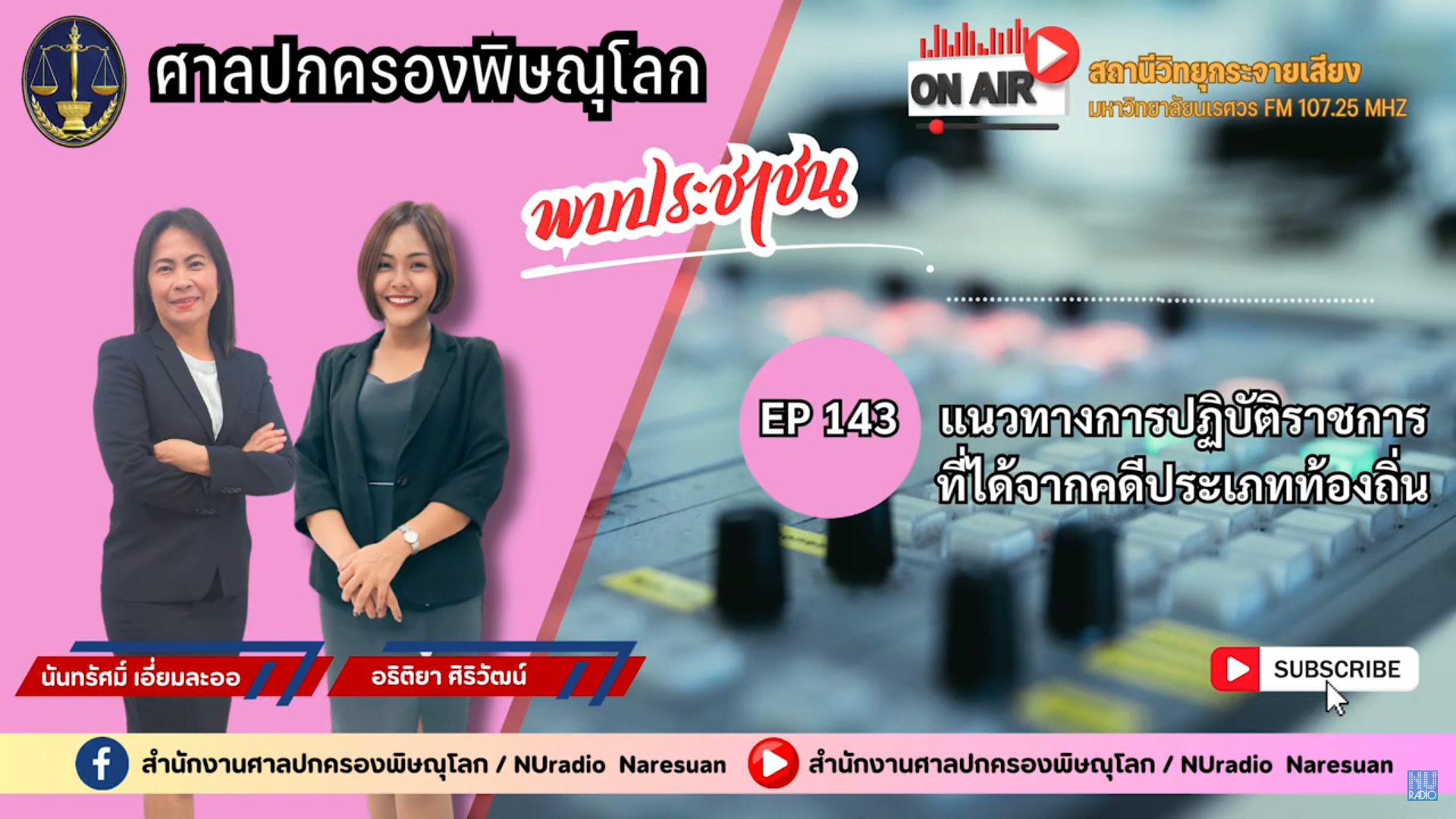 - ดำเนินรายการโดย : นางสาวอธิติยา ศิริวัฒน์ เจ้าหน้าที่ศาลปกครอง (ด้านการเผยเเพร่ประชาสัมพันธ์) ผู้ให้สัมภาษณ์ คุณนันทรัศมิ์ เอี่ยมละออ พนักงานคดีปกครองชำนาญการพิเศษ สำนักงานศาลปกครองพิษณุโลก