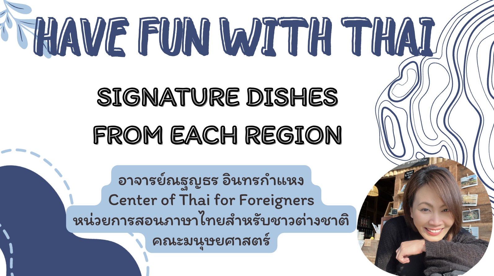 - ดำเนินรายการโดย: อาจารย์ณฐญธร อินทรกำแหง Center of Thai for Foreigners หน่วยการสอนภาษาไทยสำหรับชาวต่างชาติ