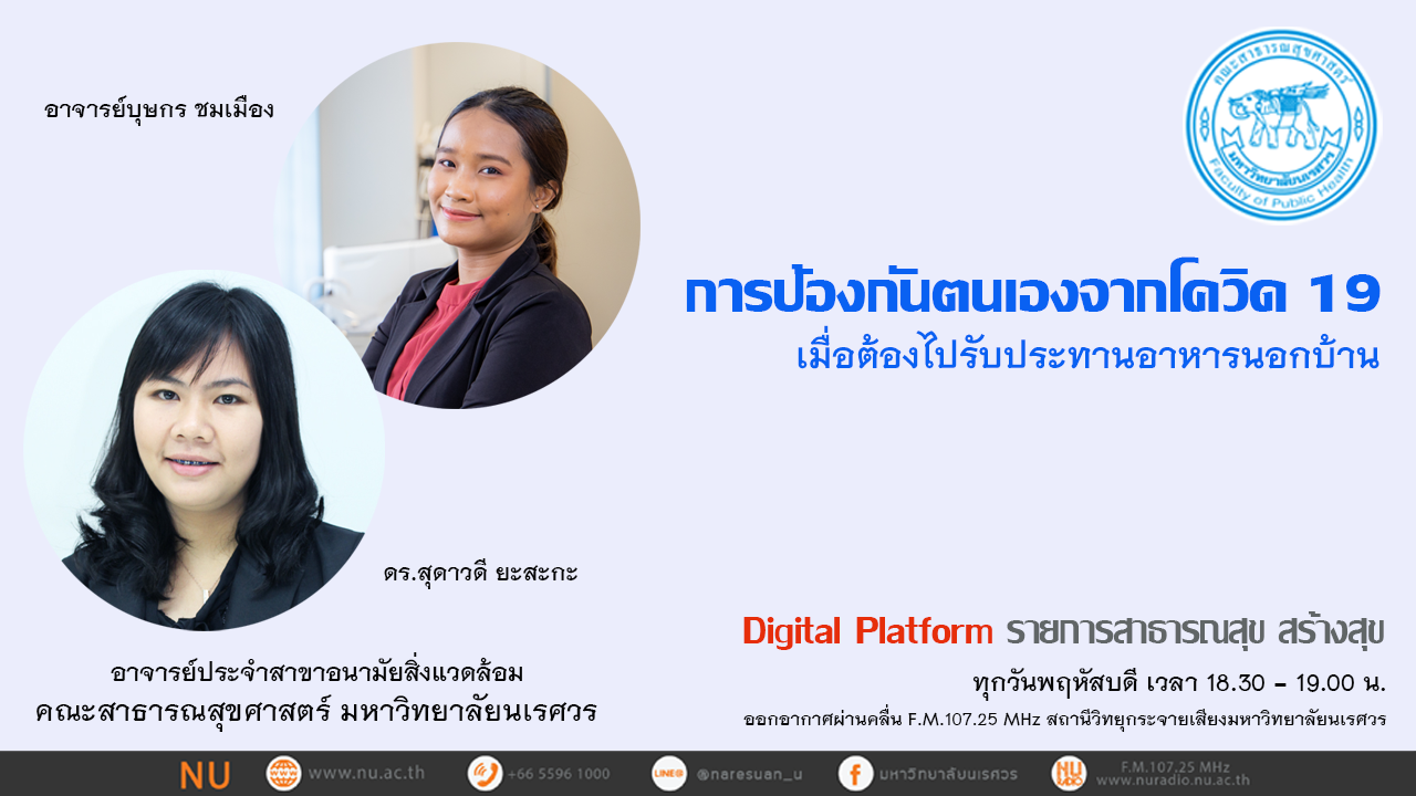 ผู้ดำเนินรายการ : ดร.สุดาวดี ยะสะกะ และอาจารย์บุษกร ชมเมือง อาจารย์ประจำสาขาอนามัยสิ่งแวดล้อม คณะสาธารณสุขศาสตร์ มหาวิทยาลัยนเรศวร
