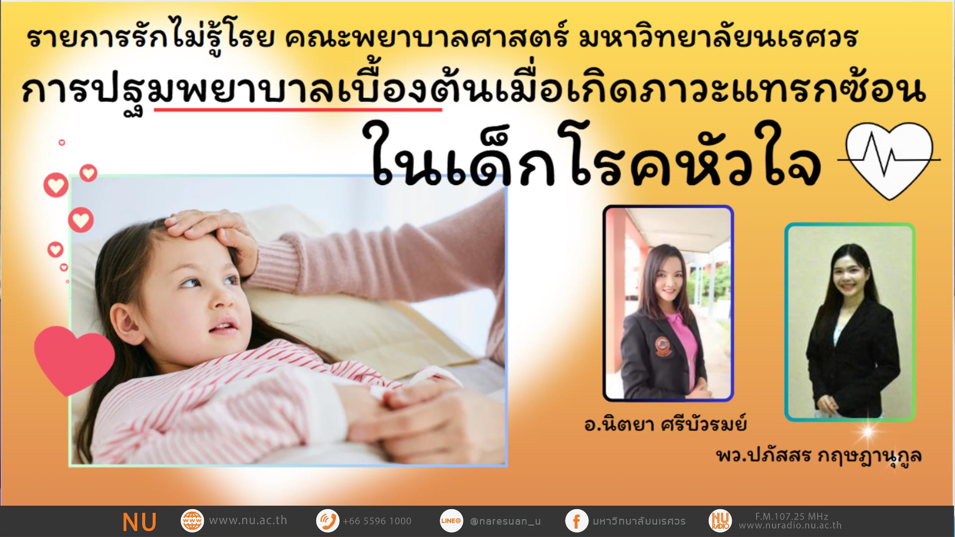 รายการ : รักไม่รู้โรย เรื่อง : การปฐมพยาบาลเมื่อเกิดภาวะแทรกซ้อนในเด็กโรคหัวใจ ดำเนินรายการโดย : อาจารย์นิตยา ศรีบัวรมย์ คณะพยาบาลศาสตร์ และ พว.ปภัสสร กฤษฎานุกูล พยาบาลประจำหอผู้ป่วยวิกฤตกุมารเวชกรรม รพ.มหาวิทยาลัยนเรศวร วันเวลาออกอากาศ : ทุกวันเสาร์ เวลา 18.30 – 19.00 น. ผ่านคลื่น : F.M. 107.25 MHz สถานีวิทยุกระจายเสียงมหาวิทยาลัยนเรศวร #วิทยุเพื่อการศึกษาสร้างปัญญาสู่มวลชน
