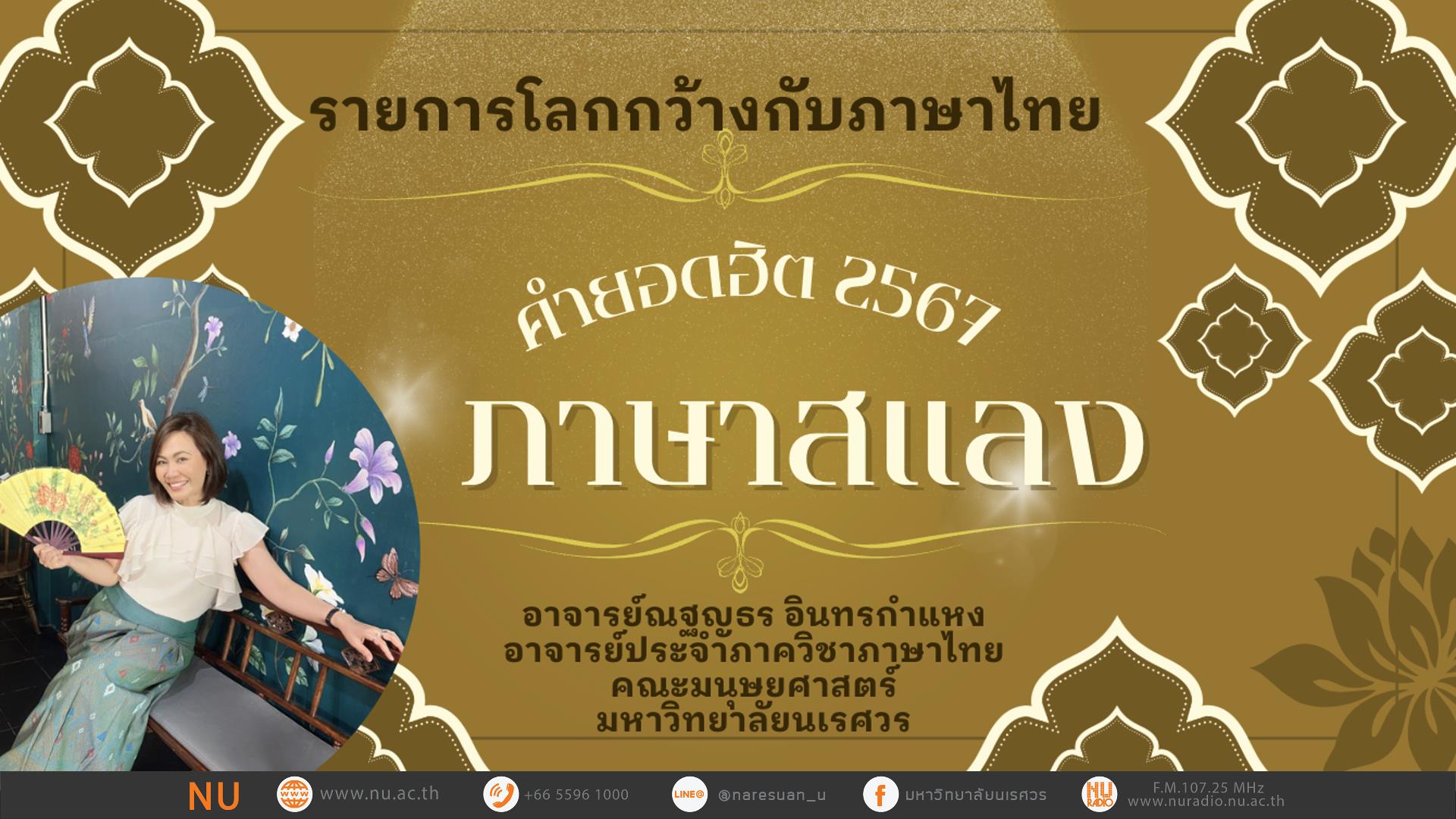 รายการ : โลกกว้างกับภาษาไทย เรื่อง : คำยอดฮิต 2567 ภาษาสแลง ดำเนินรายการโดย : อาจารย์ณฐญธร อินทรกำแหง อาจารย์ประจำภาควิชาภาษาไทย คณะมนุษยศาสตร์ มหาวิทยาลัยนเรศวร ติดตามรับฟังรายการได้ทุกวันอังคาร เวลา 08.00 – 08.30 น. ผ่านคลื่น : F.M.107.25 MHz สถานีวิทยุกระจายเสียงมหาวิทยาลัยนเรศวร