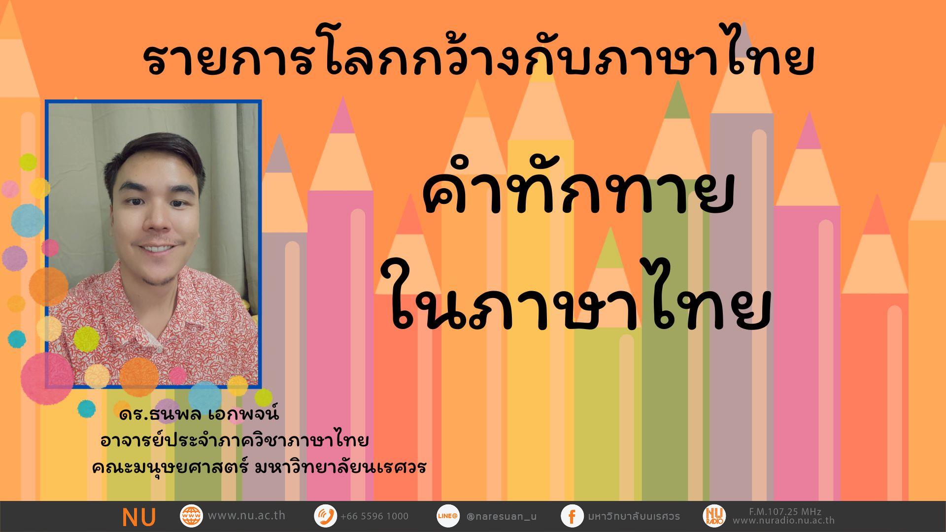 รายการ : โลกกว้างกับภาษาไทย เรื่อง : คำทักทายในภาษาไทย ดำเนินรายการโดย : ดร.ธนพล เอกพจน์ อาจารย์ประจำภาควิชาภาษาไทย คณะมนุษยศาสตร์ มหาวิทยาลัยนเรศวร ติดตามรับฟังรายการได้ทุกวันอังคาร เวลา 08.00 – 08.30 น. ผ่านคลื่น : F.M.107.25 MHz สถานีวิทยุกระจายเสียงมหาวิทยาลัยนเรศวร