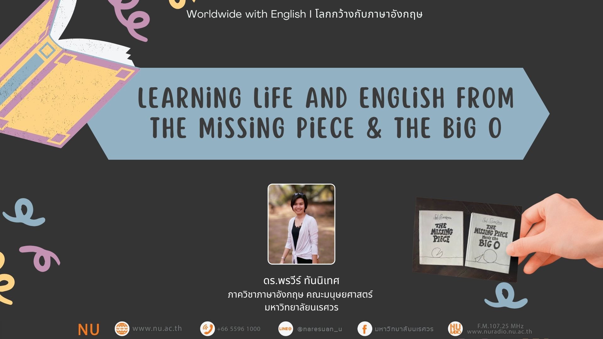 - ผู้ดำเนินรายการ : ดร.พรวีร์ ทันนิเทศ ภาควิชาภาษาอังกฤษ คณะมนุษยศาสตร์ มหาวิทยาลัยนเรศวร