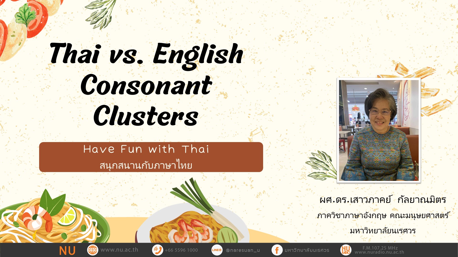 - ดำเนินรายการโดย : ผศ.ดร.เสาวภาคย์ กัลยาณมิตร Center of Thai for Foreigners หน่วยการสอนภาษาไทยสำหรับชาวต่างชาติ